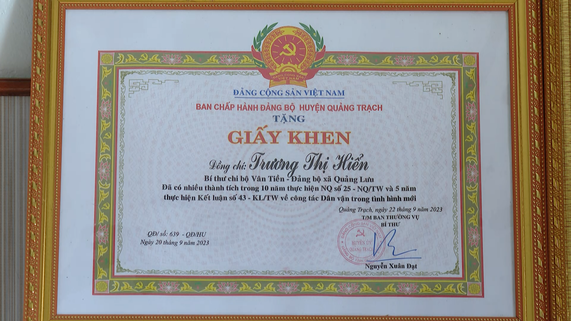 Qua gần 3 năm thực hiện Kết luận số 01 của Bộ Chính trị về tiếp tục thực hiện Chỉ thị số 05 ngày 15/5/2016 của Bộ Chính trị khóa XII “Về đẩy mạnh học tập và làm theo tư tưởng, đạo đức, phong cách Hồ Chí Minh”, tại huyện Quảng Trạch đã có nhiều gương điển hình trong học tập và làm theo Bác. Bà Trương Thị Hiển, sinh năm 1959, Bí thư Chi bộ 9, Trưởng xóm 7, thôn Vân Tiền, xã Quảng Lưu là một trong những điển hình tiêu biểu.
